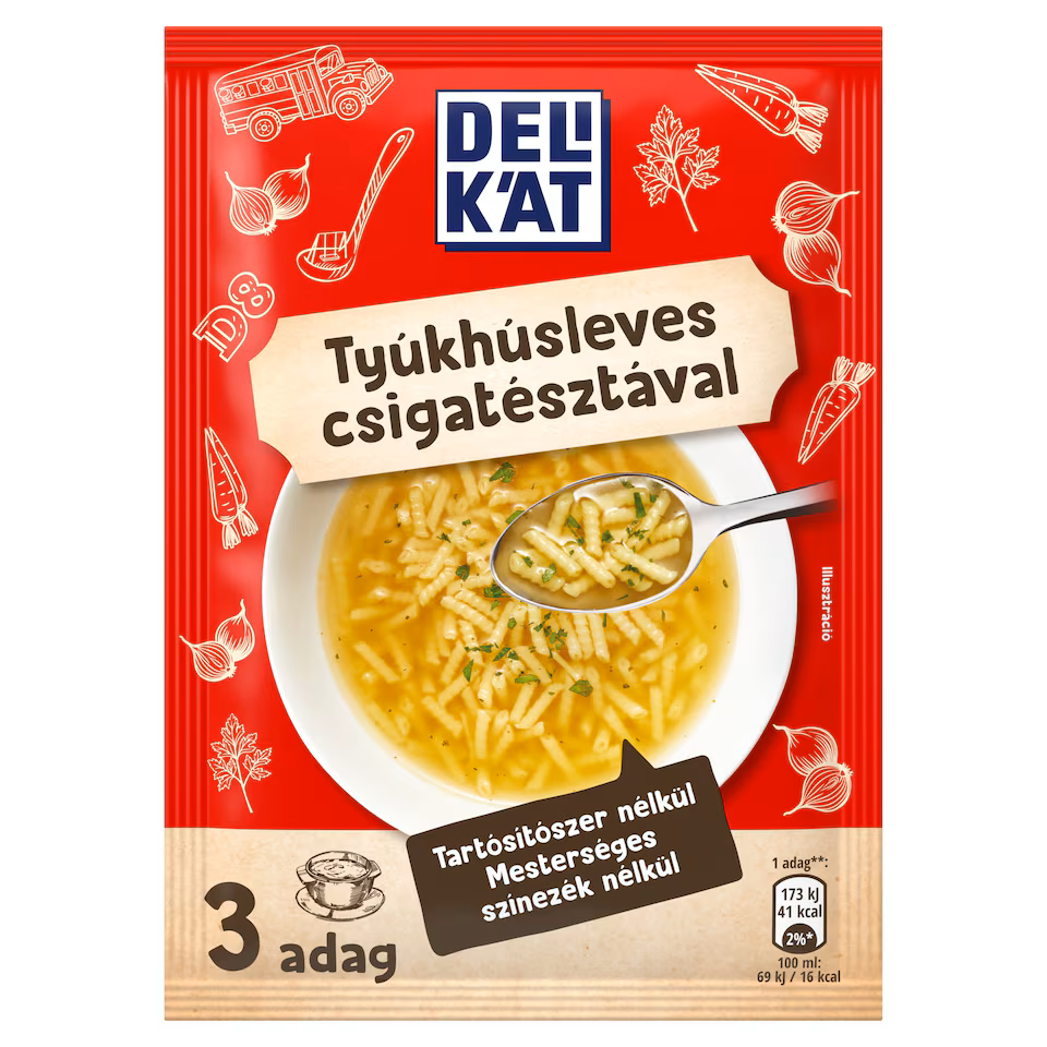 DELIKÁT Tyúkhúsleves csigatésztával 21x40g Cikkszám: 2835 Vonalkód: 0871052296524 Rendelési egység: db Kiszerelés: 21 db / karton ; Bezárás