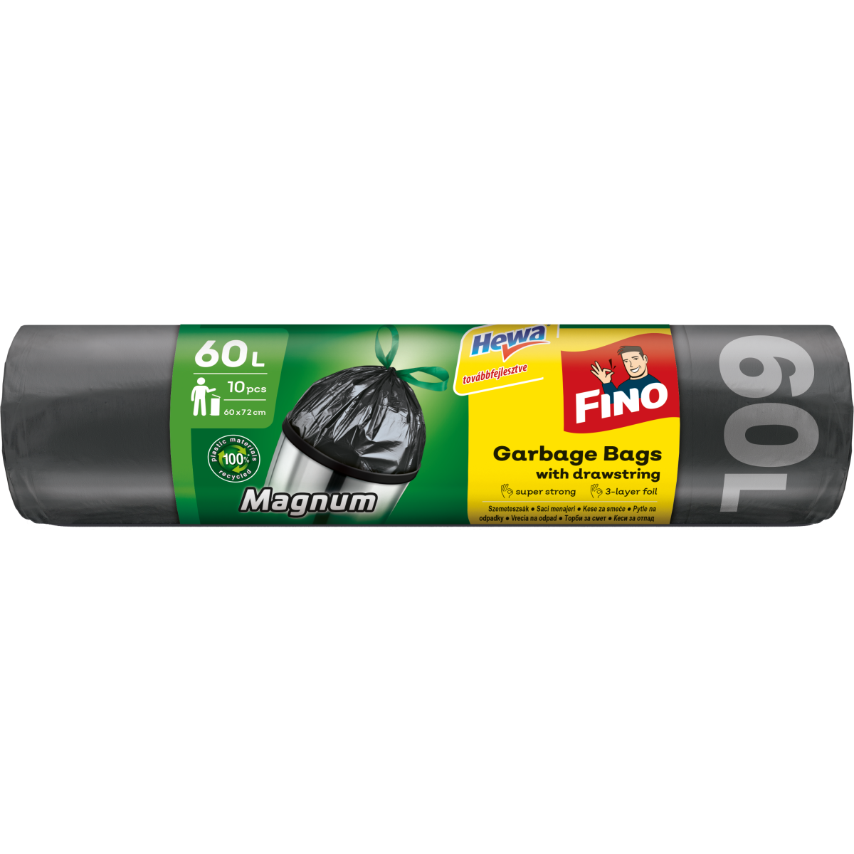 FINO Szemeteszsák MAGNUM 60l/10db Cikkszám: 726 Vonalkód: 5201314178378 Rendelési egység: db Kiszerelés: 30 db / karton ; 60 karton / raklap ; Bezárás